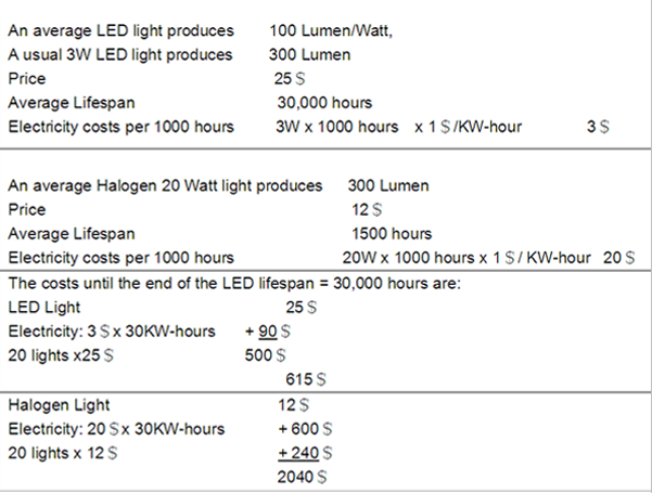 2. Comparison of LED lights versus Halogen lights regarding consumption, Performance (Lumen), Durability, Costs. During the average lifespan, 30 000 hours, of a LED light, you can save almost 3000$.